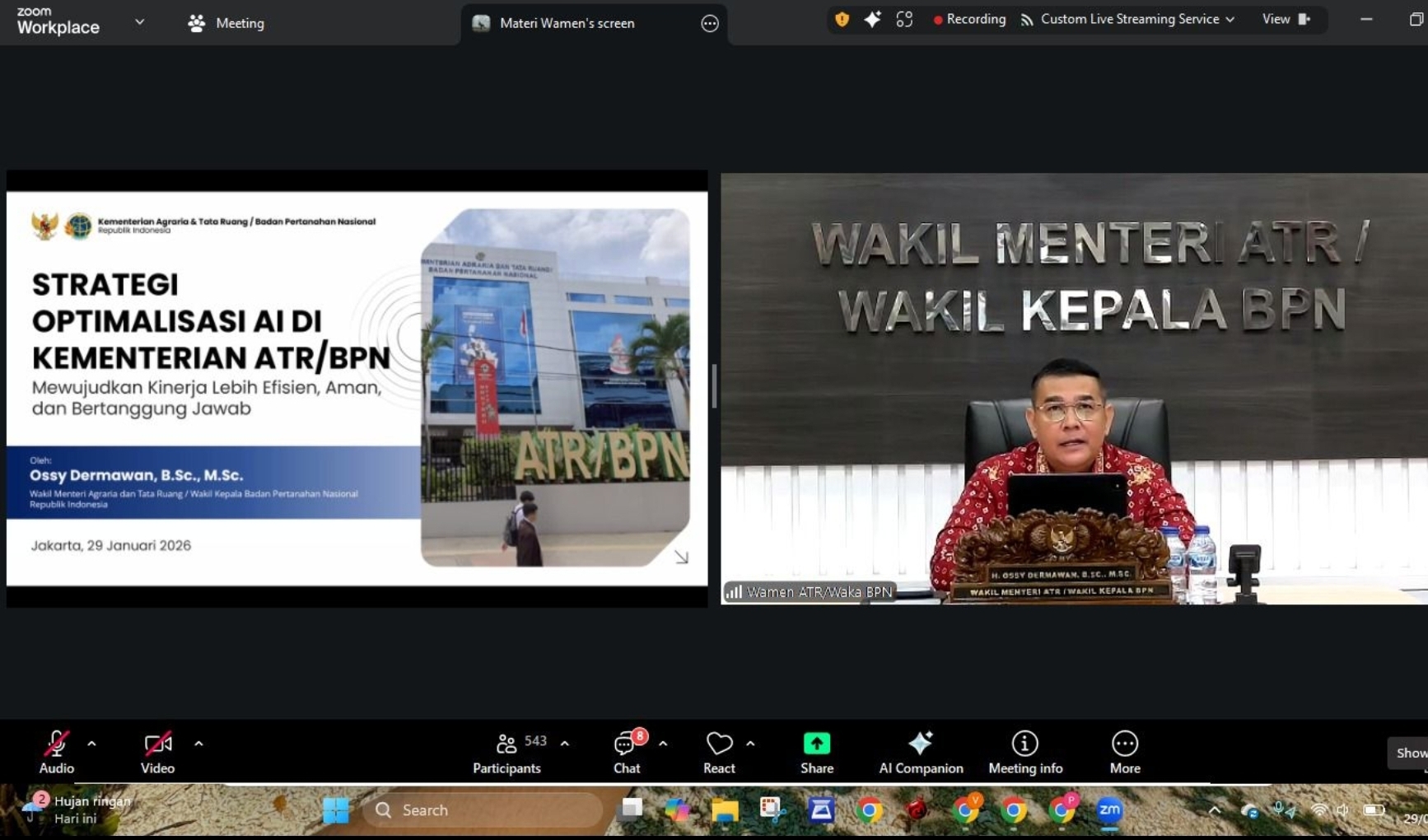 Jakarta – Pemanfaatan teknologi kecerdasan buatan atau artificial intelligence (AI) dinilai memiliki potensi besar untuk mendukung pengelolaan data pertanahan dan tata ruang di Indonesia. Hal tersebut disampaikan Wakil Menteri Agraria dan Tata Ruang/Wakil Kepala Badan Pertanahan Nasional, Ossy Dermawan, saat membuka webinar Strategi Optimalisasi AI di Kementerian ATR/BPN: Kinerja Lebih Efisien, Aman, dan Bertanggung Jawab, Kamis (29/1).